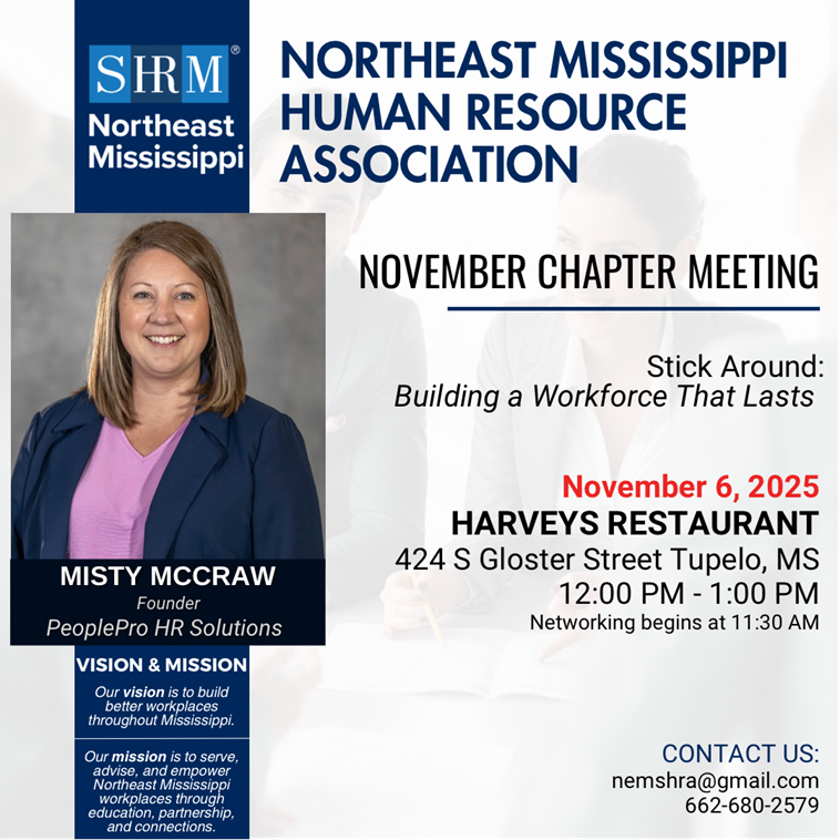 | Location: | Harveys Restaurant: 424 South Gloster St. Tupelo, MS. OPTIONS: Please arrive by 11:30a to get your food ordered and network! Lunch/Networking @ 11:30a Speaker/Meeting @ 12:00 – 1:00p NEMSHRA 196 is inviting you to a scheduled Zoom meeting. Join Zoom Meeting Register at https://us02web.zoom.us/meeting/register/KTxjFwO2TbC5hUJRMS2pxQ Link to be provided once you register. |