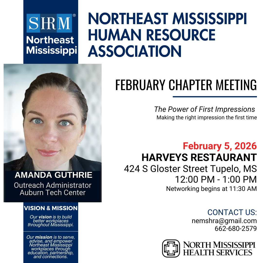 | Location: | Harveys Restaurant: 424 South Gloster St. Tupelo, MS. OPTIONS: Please arrive by 11:30a to get your food ordered and network! Lunch/Networking @ 11:30a Speaker/Meeting @ 12:00 – 1:00p NEMSHRA 196 is inviting you to a scheduled Zoom meeting. Join Zoom Meeting https://us02web.zoom.us/j/82029809835?pwd=TthfHyWAOjy1GqJNzsyzhv8PGukeGp.1 Meeting ID: 820 2980 9835 Passcode: 516286 |